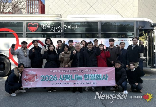 뉴스펀치 김윤걸 기자 | (재)부산문화회관(대표이사 차재근)은 2월 12일(목) 오전 9시 30분부터 부산문화회관 다듬채 앞에서 노사 합동으로 '2026 사랑나눔 헌혈행사'를 진행했다.