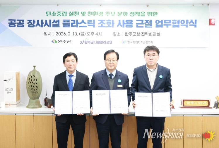 13일 완주군은 군청 전략회의실에서 (사)한국화훼자조금협의회, 완주군시설관리공단과 함께 ‘플라스틱 조화 근절 및 생화 헌화 문화 정착을 위한 업무협약(MOU)’을 체결했다.