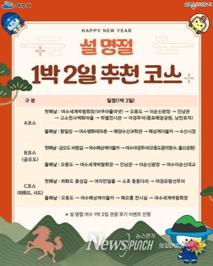 뉴스펀치 최영남 기자 | 여수시가 설 명절 연휴를 맞아 가족 단위 관광객과 귀성객을 대상으로 대표 관광지를 연계한 체류형 1박 2일 코스를 홍보하고 이벤트를 진행한다.
