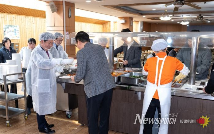 뉴스펀치 이현승 기자 | 김창규 제천시장은 13일 설 명절을 앞두고 시민과 지역발전을 위해 힘쓰고 있는 직원들을 격려하고자 시청 구내식당에서 떡만둣국 배식 봉사를 했다.
