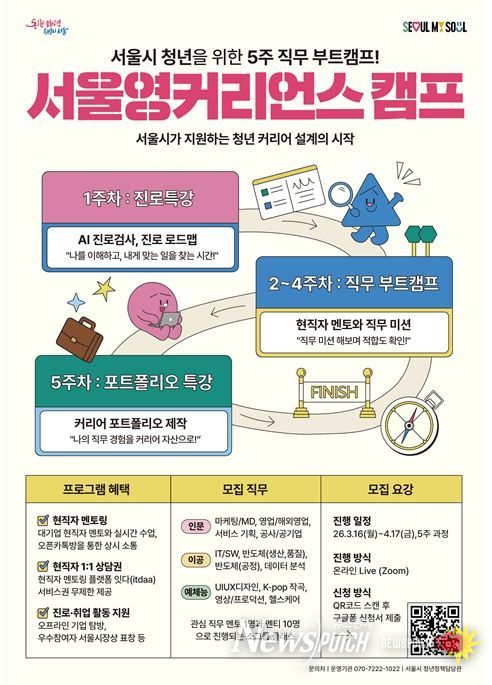 뉴스펀치 박상훈 기자 | 서울시가 대학교 재학생 대상 일 경험 지원사업인 ‘서울영커리언스 캠프(부트캠프)·챌린지(팀 공모전)’ 참여자 모집에 나선다. 올해 처음 선보이는 본 사업은 2월부터 모집기간을 거쳐 3월 프로그램 참여를 실시할 계획이다.