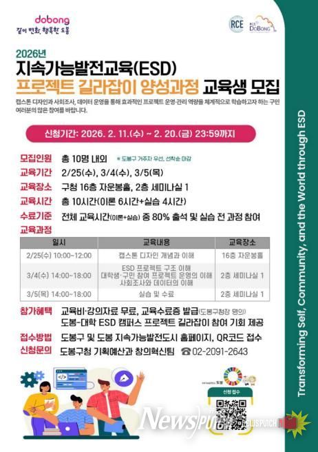 교육은 2월 25일과 3월 4일, 3월 5일에 걸쳐 총 10시간(이론 6시간, 실습 4시간) 과정으로, 도봉구청에서 진행된다. 출석률 80% 이상 및 실습 전 과정 참여 시 교육수료증이 발급되며, ‘도봉-대학 ESD 캠퍼스 프로젝트 길라잡이’ 참여 기회도 제공된다.