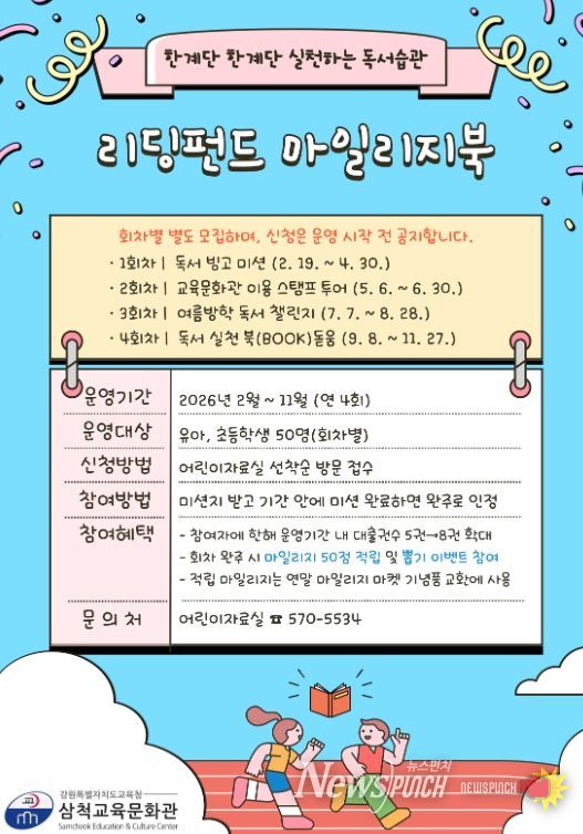 뉴스펀치 조평훈 기자 | 삼척교육문화관은 관내 유아·초등학생을 대상으로 2월부터 11월까지 어린이 독서 실천 프로그램 ‘리딩펀드 마일리지북’을 운영한다.
