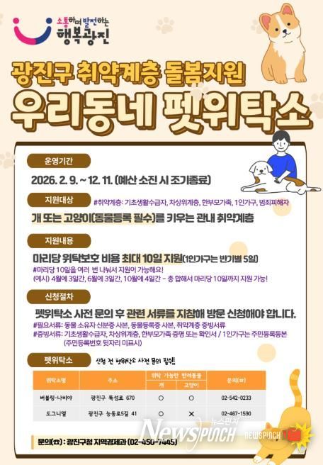 뉴스펀치 박상훈 기자 | 광진구가 갑작스러운 상황으로 인해 반려동물 임시보호가 필요한 취약계층을 위해 ‘우리동네 펫위탁소’를 운영한다.