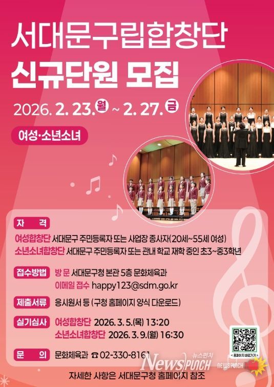 뉴스펀치 박상훈 기자 | 서대문구가 지역 대표 문화사절단의 역할을 함께할 참신하고 재능있는 ‘구립여성합창단’과 ‘구립소년소녀합창단’ 신규 단원을 이달 23일부터 27일까지 모집한다.