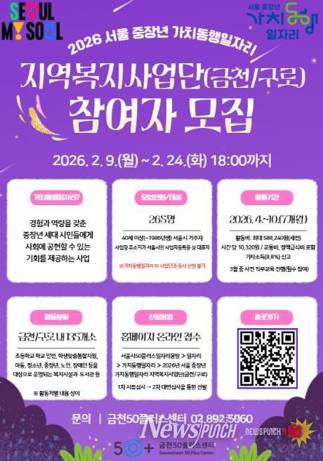 뉴스펀치 박상훈 기자 | 금천구는 금천50플러스센터에서 경험과 역량을 갖춘 중장년 세대들에게 지속적인 사회참여를 지원하기 위해 ‘2026년 서울 중장년 가치동행일자리사업’ 참여자를 모집한다고 밝혔다.