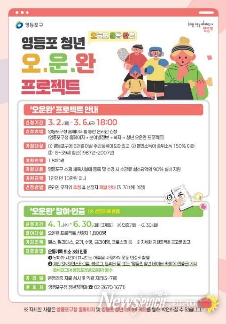 최호권 영등포구청장은 “바쁜 일상에 쫓겨 운동을 미뤄온 청년들이 개인의 건강과 일상의 활력을 되찾기 바란다”라며 “청년들에게 도움이 되고 체감할 수 있는 실질적 정책을 지속적으로 확대해 나가겠다”라고 전했다.