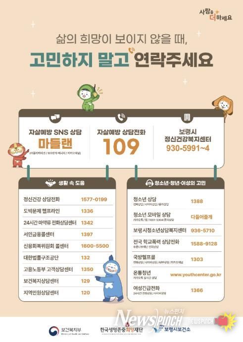 뉴스펀치 이현승 기자 | 보령시는 자살률이 상대적으로 높아지는 봄철을 맞아 오는 2월 23일부터 3월 8일까지 2주간 자살 고위험시기 집중관리 기간을 운영한다.