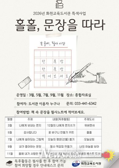 뉴스펀치 조평훈 기자 | 화천교육도서관은 오는 3월부터 11월까지 깊이 있는 독서문화의 확산을 위해 2026년 특색사업 ‘홀홀, 문장을 따라’를 운영한다.