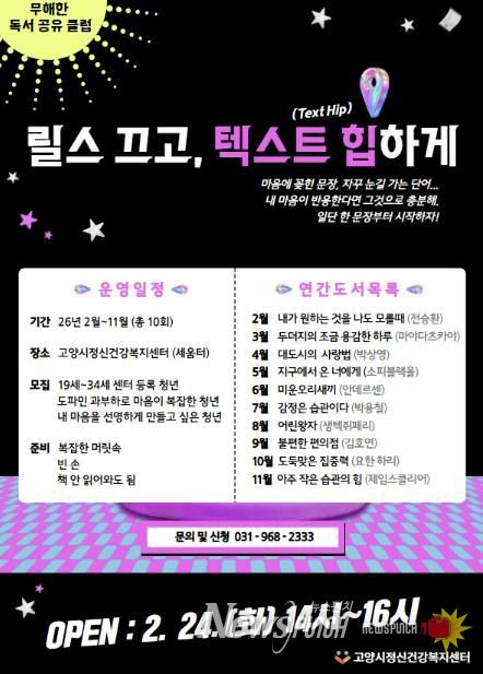뉴스펀치 박상훈 기자 | 고양시정신건강복지센터는 만19~34세 등록청년을 대상으로 ‘무해한 독서 공유 클럽’(릴스 끄고, 텍스트 힙하게)을 매달 운영한다.
