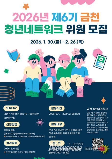 뉴스펀치 박상훈 기자 | 금천구는 오는 2월 26일까지 ‘2026년 제6기 금천 청년네트워크’에 참여할 청년을 모집한다고 밝혔다.