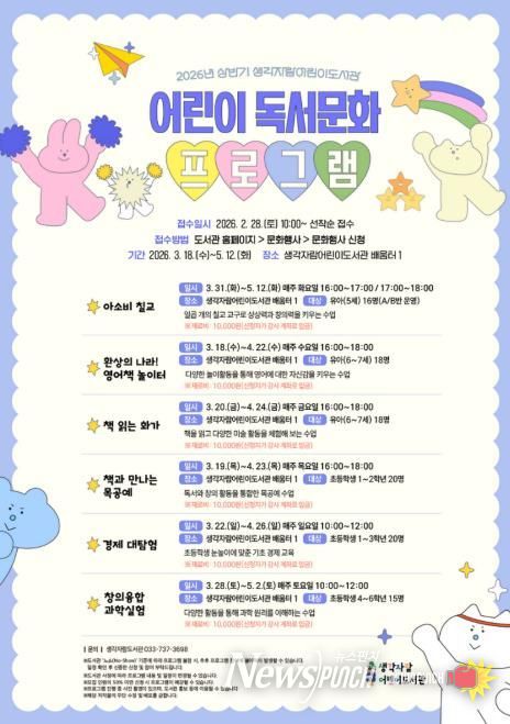 뉴스펀치 조평훈 기자 | 원주시 생각자람어린이도서관은 유아와 초등학생을 대상으로 ‘2026년 상반기 어린이 독서문화 프로그램’을 운영한다.