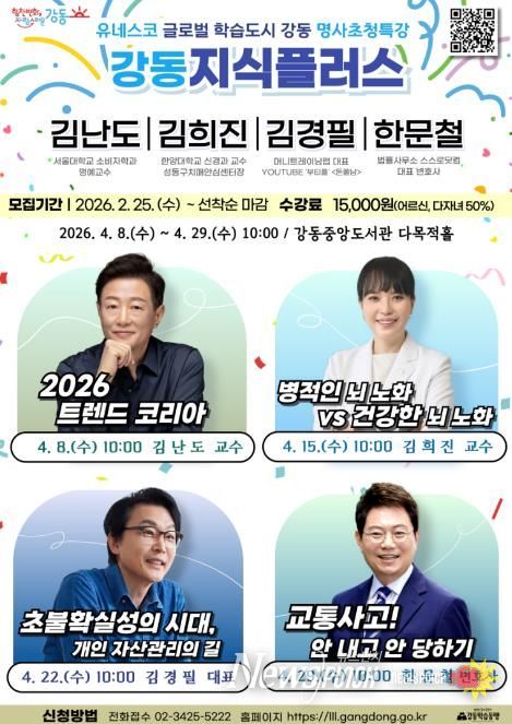 '강동지식플러스'는 매년 상·하반기 운영되는 강동구 대표 명사특강 프로그램이다. 이번 특강은 ‘100세까지 흔들리지 않는 삶의 길잡이’를 주제로 경제·건강·안전 등 각 분야 전문가 4인을 초청해 구민들에게 깊이 있는 지식과 실질적인 정보를 제공할 예정이다.