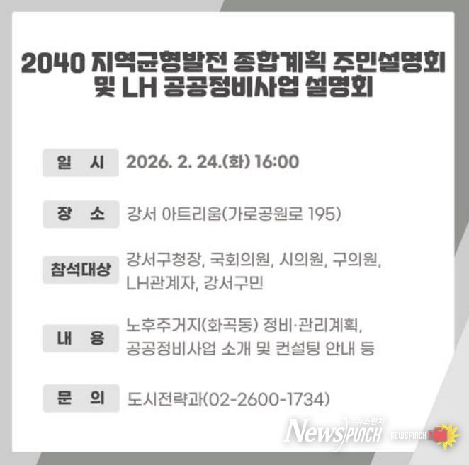 뉴스펀치 박상훈 기자 | 서울 강서구는 오는 24일 오후 4시 강서아트리움(가로공원로 195)에서 지역 균형발전을 위한 주민설명회를 개최한다.