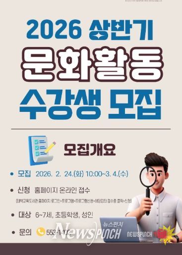 뉴스펀치 조평훈 기자 | 태백교육도서관은 3월 18일부터 7월 8일까지 지역 내 유아·초등학생·성인을 대상으로 ‘2026년 상반기 문화활동강좌’를 운영한다.