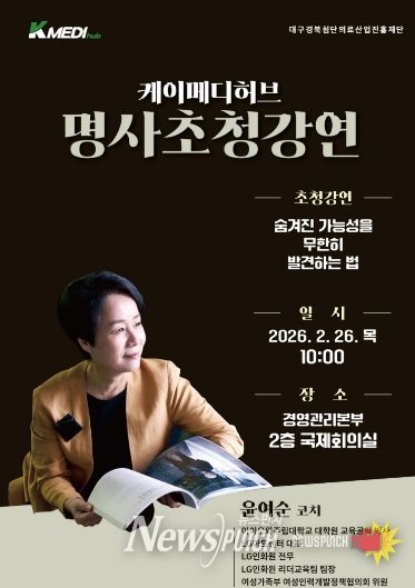 뉴스펀치 조평훈 기자 | K-MEDI hub가 오는 2월 26일 10시 국제회의실에서 윤여순 코칭전문가를 초빙해 ‘제6회 명사초청강연’을 개최한다.