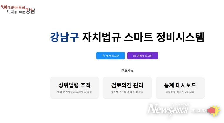 뉴스펀치 박상훈 기자 | 꿈이 모이는 도시, 미래를 그리는 강남구가 상위법 개정 사항을 신속하게 반영하기 위해 인공지능(AI)을 활용한 ‘자치법규 스마트 정비시스템’을 자체 구축했다.