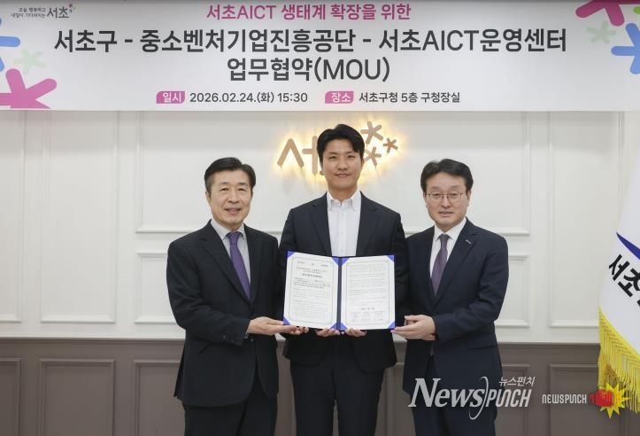 뉴스펀치 박상훈 기자 | 서울 서초구는 24일 중소벤처기업진흥공단, 서초AICT운영센터와 3자 업무협약을 체결하며 서초AICT 내 인공지능(AI), 정보통신기술(ICT) 분야 중소·벤처기업의 육성과 혁신 생태계 조성에 힘을 모으기로 했다.