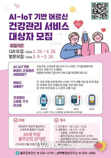 울주군보건소 관계자는 “온라인 접수 시스템을 통해 접수 현장의 혼잡을 줄이고, 선착순이 아닌 필요도 중심으로 대상자를 선정해 꼭 필요한 분들이 혜택을 받도록 준비했다”며 “스마트 기술을 활용해 어르신들이 스스로 건강한 생활 습관을 형성할 수 있도록 적극 지원하겠다”고 말했다.