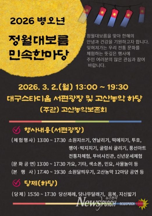 뉴스펀치 조평훈 기자 | 대구 수성구는 2026년 병오년을 맞아 정월대보름을 하루 앞둔 다음 달 2일 대구스타디움 서편광장에서 고산농악보존회 주최·주관으로 구민의 안녕을 기원하는 ‘정월대보름 민속 한마당’을 개최한다.