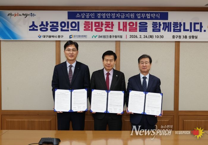 뉴스펀치 조평훈 기자 | 대구신용보증재단이 2월 24일 중구청 상황실에서 중구청, iM뱅크 중구청지점과 소상공인 경영안정 지원을 위한 업무협약을 체결했다.
