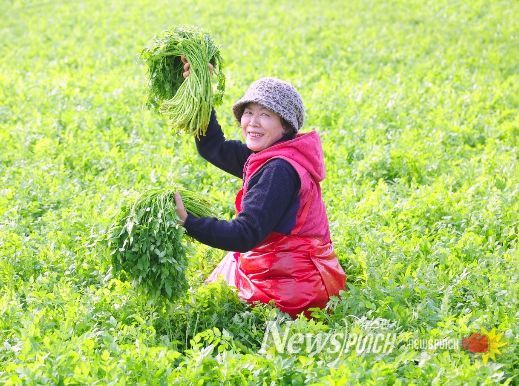 뉴스펀치 박세훈 기자 | 25일 경남 함양군 백전면 백운리 윗 새재농원 시설하우스에서 홍정표씨가 고랭지 지하암반수로 재배해 수확한 청정 밭미나리를 들어 보이고 있다. 이곳 백운산 자락에서 자란 미나리는 해발 600m에서 친환경적으로 재배해 향이 진하며 줄기가 부드럽고 아삭한 식감이 일품이다.