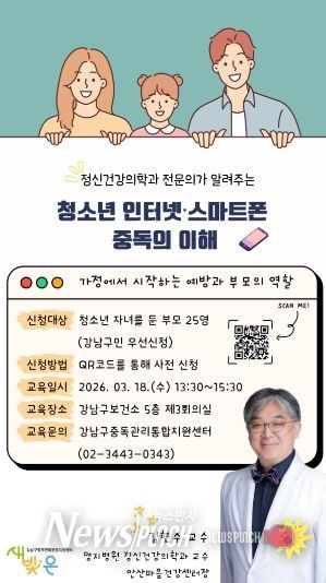 강남구중독관리통합지원센터 주관으로 3월 18일 오후 1시 30분부터 3시 30분까지 강남구보건소 5층 제3회의실에서 진행한다. 대상은 청소년 자녀를 둔 보호자다.