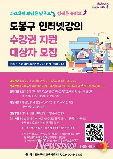 뉴스펀치 박상훈 기자 | 서울 도봉구(구청장 오언석)가 ‘2026년 인터넷강의 수강권 지원사업’ 대상자를 모집한다.