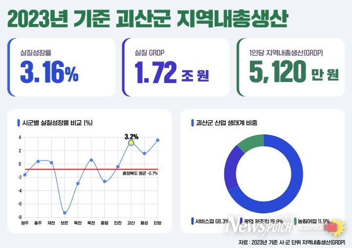 충북도가 최근 공표한 2023년 기준 ‘충청북도 시·군 단위 지역내총생산(GRDP)’ 추계결과에 따르면 괴산군의 실질성장률은 3.2%로 단양군(3.6%)에 도내 두 번째로 높았다.