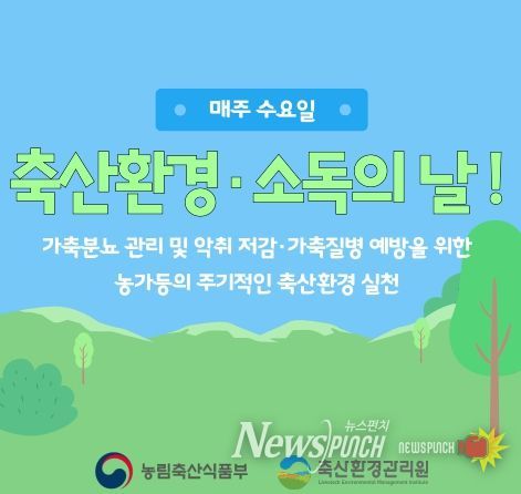 한편, 농림축산식품부는 매주 수요일을 ‘축산환경·소득의 날’로 지정하여 축산농가와 관련 시설이 소독, 청소 및 구서(쥐를 잡아 없애는 일), 구충 방제 등 축산환경 개선 활동을 실천할 수 있도록 독려하고 있으며, 자율적인 참여 분위기 조성을 통해 쾌적한 축산환경 조성에 힘쓰고 있다.