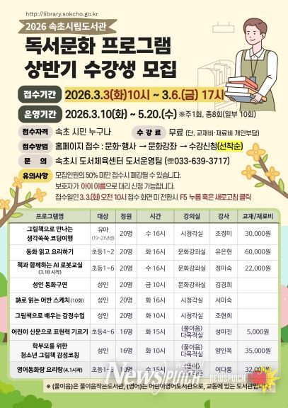 뉴스펀치 조평훈 기자 | 속초시립도서관은 3월 3일 오전 10시부터 3월 6일 오후 5시까지 속초시민을 대상으로 2026년 상반기 독서문화 프로그램 수강생을 모집한다.
