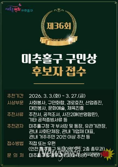 추천 서류는 미추홀구청 총무과로 직접 방문하거나 우편(미추홀구 독정이로 95, 미추홀구청 총무과)을 통해 접수할 수 있으며, 수상자는 미추홀구 구민상심의위원회의 심의를 거쳐 최종 결정된다. 시상은 5월 1일 제36회 구민의 날 기념식에서 진행될 예정이다.
