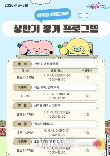 뉴스펀치 정홍균 기자 | 인천 미추홀구 구립도서관은 오는 3월부터 5월까지 운영되는 상반기 정기 프로그램의 수강생을 모집한다고 밝혔다.