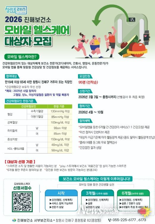 뉴스펀치 박세훈 기자 | 창원특례시 진해보건소는 시간·장소 제약으로 건강관리에 어려움을 겪는 주민을 위해 2026년 ‘모바일 헬스케어’ 사업 참여자를 모집한다고 밝혔다.