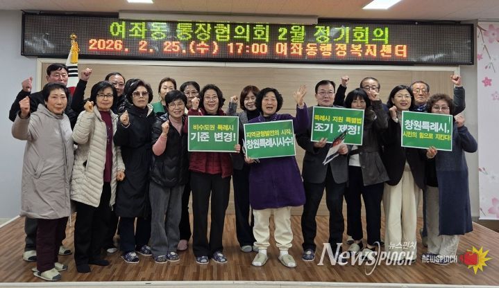 뉴스펀치 박세훈 기자 | 창원특례시 진해구 여좌동은 지난 25일 2월 통장 정기회의를 통해 창원특례시 지위 유지 및 권한 확보를 위한 주민 참여 캠페인을 실시했다.
