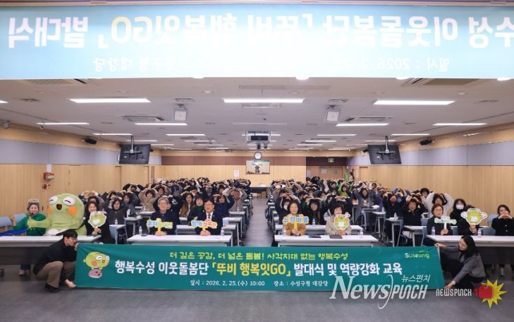 뉴스펀치 조평훈 기자 | 대구 수성구는 지난 25일 구청 대강당에서 지역사회 인적 안전망 강화를 위한 이웃돌봄단 ‘뚜비행복잇고(GO)’ 발대식을 개최하고 본격적인 활동에 나섰다.