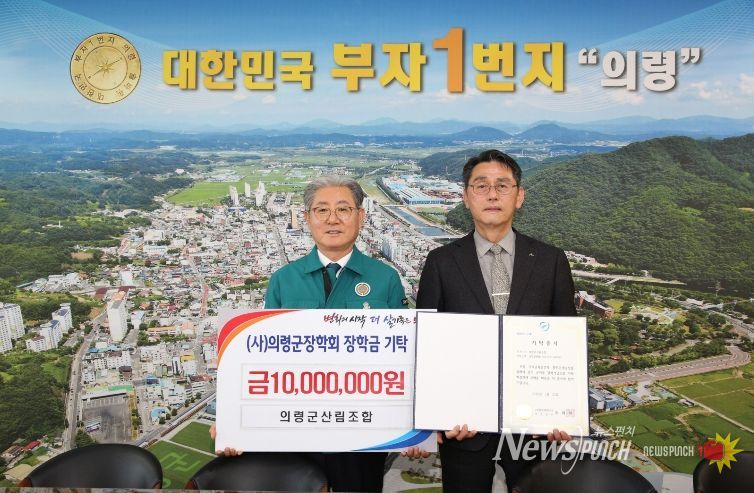 뉴스펀치 박세훈 기자 | 의령군은 지난 25일 의령군 산림조합이 (사)의령군장학회에 장학금 1,000만원을 기탁했다고 밝혔다.