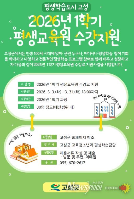 뉴스펀치 박세훈 기자 | 고성군은 군민들에게 폭넓은 평생학습의 기회를 제공하고, 다양하고 전문적인 평생학습 프로그램 참여로 함께 배우고 성장하고자 ‘2026년 1학기 평생교육원 수강료 지원사업’을 시행한다.