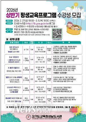 뉴스펀치 박상훈 기자 | 경기도교육청성남도서관이 학생, 학부모, 다문화 청소년 및 어르신을 대상으로‘2026년 상반기 평생교육 프로그램’을 운영한다.
