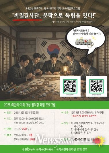 뉴스펀치 박상훈 기자 | 서울 성북구가 3·1운동 107주년과 광복 81주년을 맞아 3월 1일 성북근현대문학관과 문화공간이육사에서 연계 교육 체험 프로그램 ‘비밀결사단, 문학으로 독립을 잇다’를 운영한다.