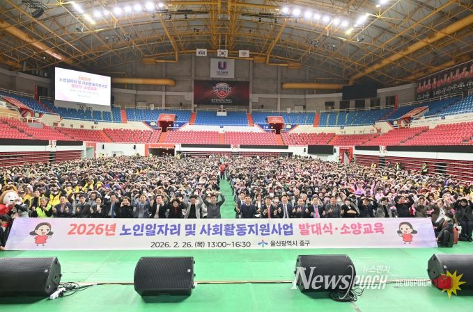뉴스펀치 김윤걸 기자 | 울산 중구가 2월 26일 오후 1시 동천체육관에서 2026년 노인일자리 및 사회활동지원사업 발대식·소양교육을 진행했다.