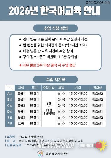 뉴스펀치 김윤걸 기자 | 울산중구가족센터(센터장 서선자)가 2026년 결혼이민자 역량강화 지원사업의 일환으로 ‘한국어 교육 과정’을 운영한다.
