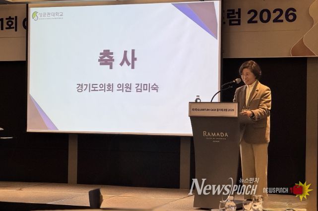 뉴스펀치 박상훈 기자 | 경기도의회 미래과학협력위원회 김미숙 의원(더불어민주당, 군포3)은 26일 수원 라마다프라자호텔에서 열린 ‘제1회 QUANTUM-GAIA 협의체 포럼 2026’에 참석해 축사를 전하고, 양자산업 생태계 조성을 위한 협력 필요성을 강조했다.