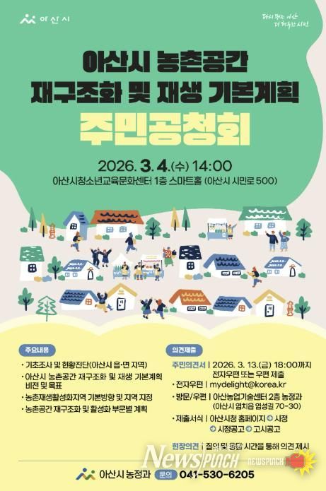 뉴스펀치 이현승 기자 | 아산시는 '농촌공간 재구조화 및 재생 기본계획' 수립과 관련해 지역 주민과 관계 전문가의 의견을 수렴하기 위한 주민공청회를 오는 3월 4일 오후 2시, 아산시 청소년교육문화센터 1층 스마트홀(시민로 500)에서 개최한다.