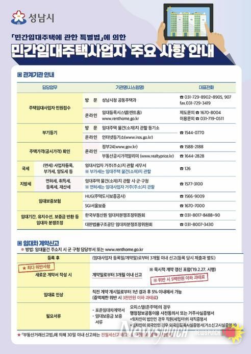 뉴스펀치 박상훈 기자 | 성남시는 잦은 법령 개정과 제도 변화로 혼란을 겪는 지역 임대사업자를 지원하기 위해 ‘등록 임대사업자 주요 준수사항’ 안내문을 제작해 발송할 예정이라고 밝혔다.