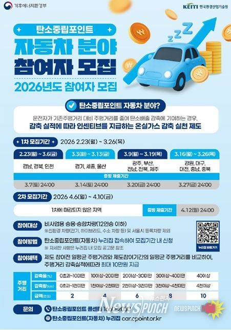 뉴스펀치 김윤걸 기자 | 울산시는 자동차 주행거리 감축 실적을 평가해 성과급(인센티브)을 지급하는 ‘2026년 자동차 탄소중립포인트’를 시행한다고 밝혔다.