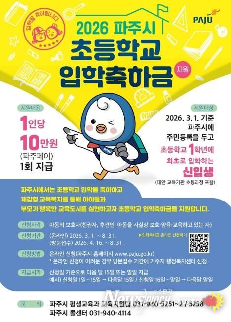 한편, 파주시는 지난 2023년부터 지자체 자체 사업으로 초등학교 입학축하금을 지원해 오고 있으며, 지난해에는 3,905명의 신입생에게 총 3억 9천5십만 원을 지급해 시민들의 큰 호응을 얻은 바 있다.