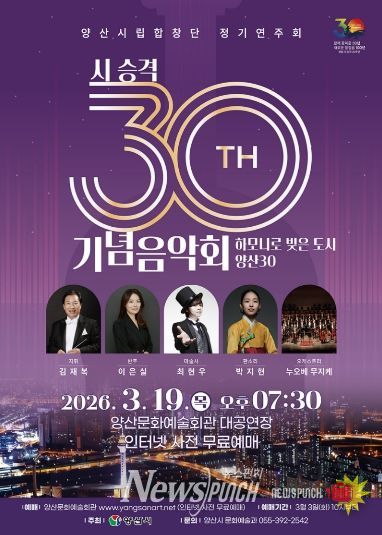 뉴스펀치 박세훈 기자 | 양산시는 오는 2026년 3월 19일 목요일 저녁 7시 30분부터 90분간 양산문화예술회관 대공연장에서 시 승격 30주년을 기념하는 양산시립합창단 정기연주회 ‘하모니로 빚은 도시 양산30’을 개최한다.