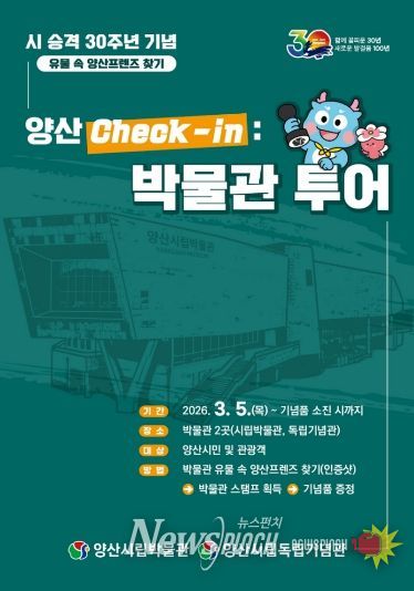뉴스펀치 박세훈 기자 | 양산시립박물관(관장 신용철)은 시 승격 30주년 및 양산 방문의 해를 맞아 3월 5일부터 양산시민 및 관광객을 대상으로 박물관 투어 특별 이벤트를 운영한다고 밝혔다.