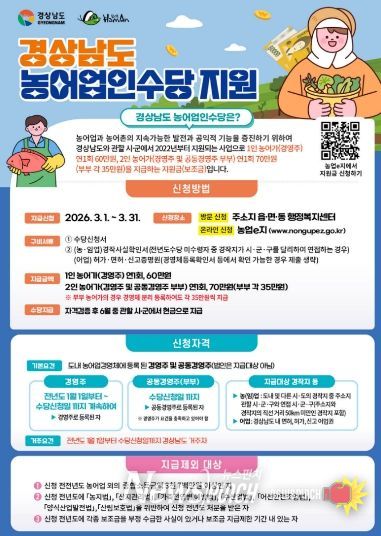 신청 대상은 2025년 1월 1일부터 경상남도에 주민등록을 두고 농어업경영체로 등록된 경영주와 공동경영주이며, 공동경영주는 부부만 인정한다. 신청은 주소지 읍면동 행정복지센터를 방문해 할 수 있으며, ‘농업이(e)지’ 누리집과 앱에서 간편하게 신청할 수 있다.